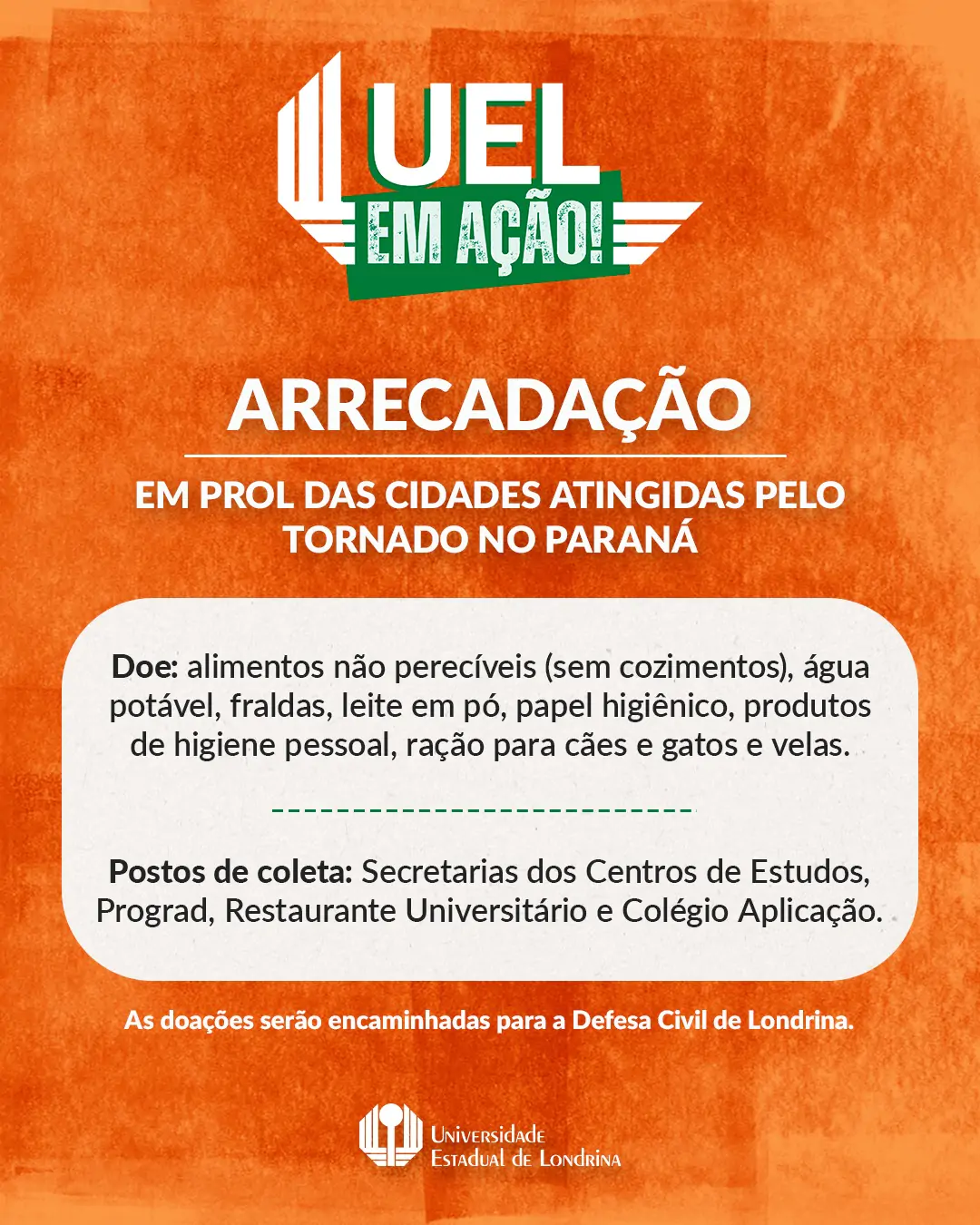 A Universidade lançou a campanha UEL em Ação, com o objetivo de ajudar os desabrigados das cidades do Centro-Sul do Estado do Paraná, que abrange as cidades de Rio Bonito do Iguaçu, Guarapuava, Candói (atingidas pelo tornado) e todas as demais que precisarem, incluindo Londrina.