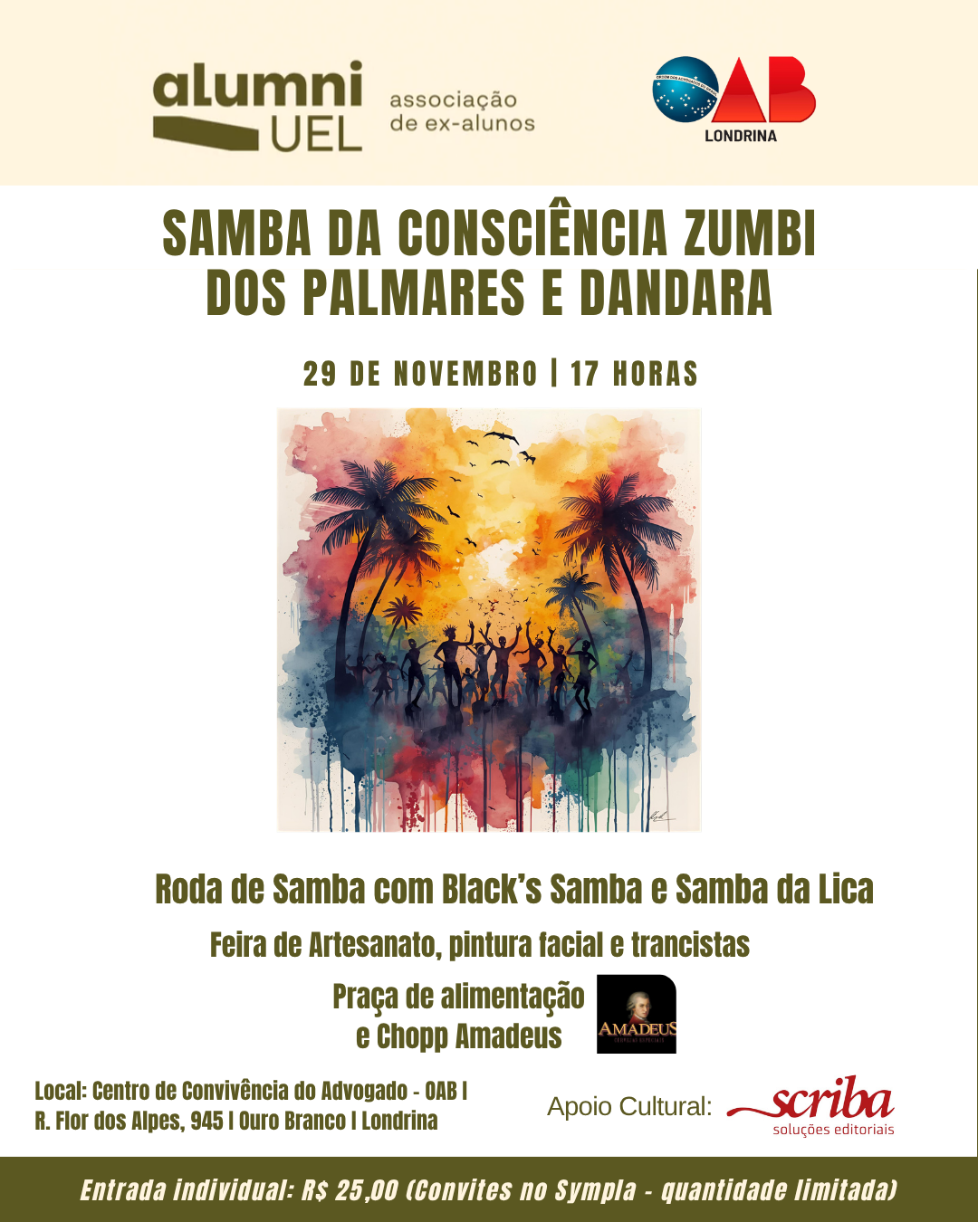 Compre o seu ingresso aqui: https://www.sympla.com.br/evento/samba-da-consciencia-zumbi-dos-palmares-oab-e-alumni-uel/3181500