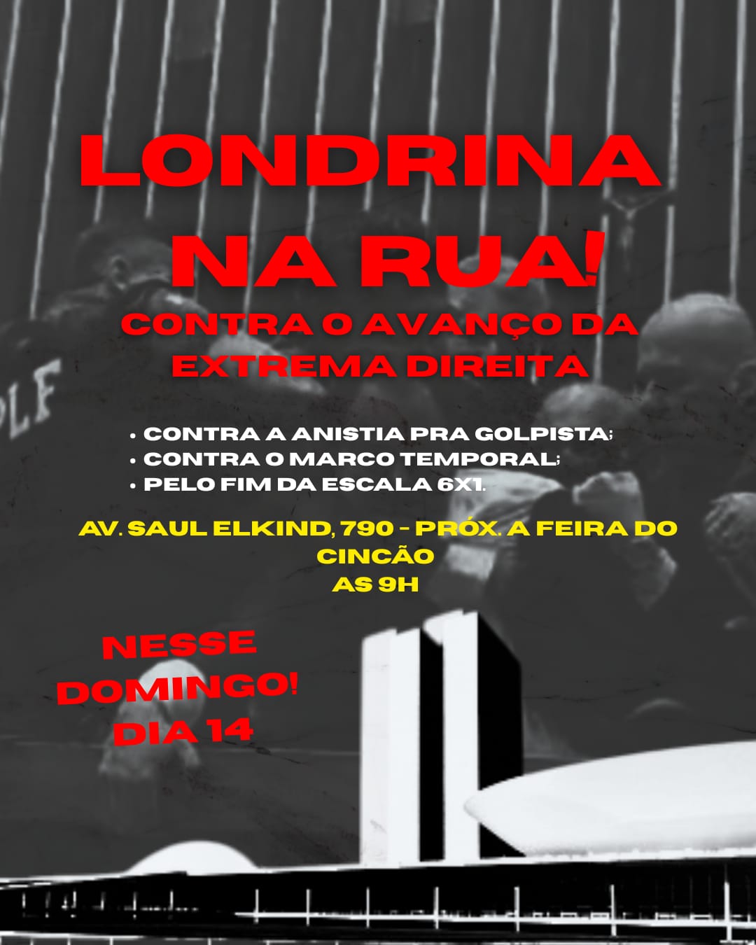 Londrina está no mapa das mobilizações que acontecem no próximo domingo (14) contra a PL da Dosimetria, que reduz penas de Jair Bolsonaro e de outros condenados pelos ataques golpistas de 8 de janeiro de 2023, contra o Marco Temporal e pelo fim da Escala 6x1. A Alumni UEL, Associação dos Ex-alunos da Universidade Estadual de Londrina, apoia o movimento que se reúne a partir das 9h da manhã, em frente à Escola de Circo que fica na Avenida Saul Elkind, 790, saindo em cortejo pela Feira Livre do Cincão. Em caso de chuva forte, o ato está previso para permanecer no local .