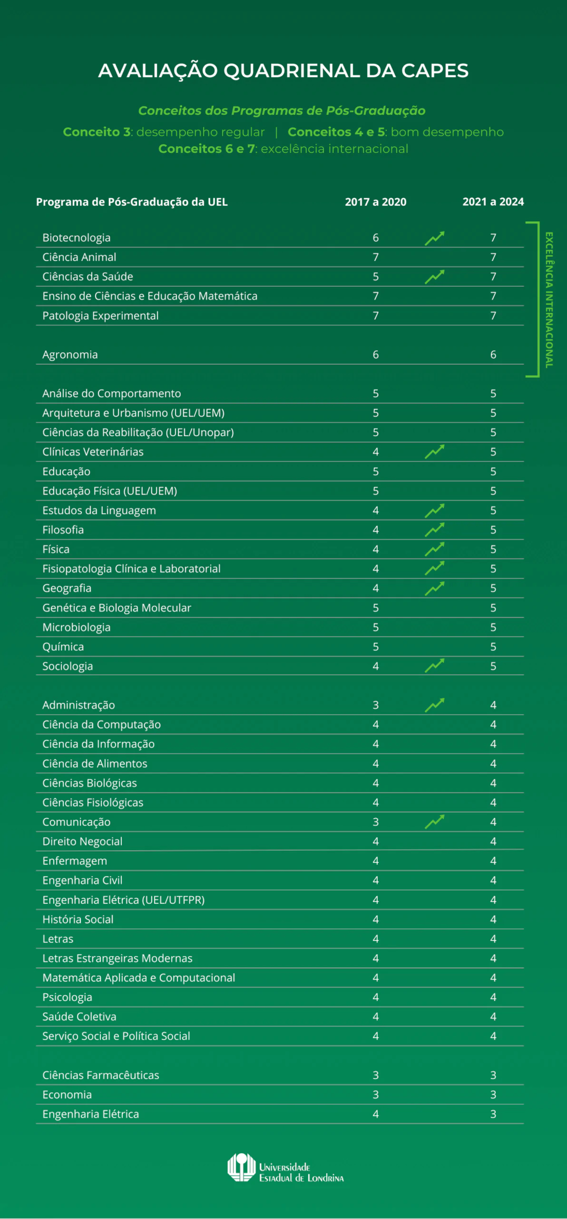 A partir desta avaliação da Capes, a UEL elenca cinco programas de excelência internacional, se destacando nas áreas de saúde, biotecnologia e exatas. De acordo com informações da Pró-reitoria de Pesquisa e Pós-graduação (PRoPPG), a Universidade soma 49 programas, sendo 42 com sede em seu Campus, em Londrina e integra outros sete nacionais. As notas divulgadas se referem aos programas sediados na UEL, totalizando:
